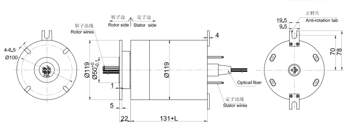 HFO408系列是光電一體化旋轉接頭,同時能傳輸4路光纖和1~96路信號(2A),整體外徑(119mm),整個產品非常緊湊,專門為對空間尺寸有要求的應用場合。