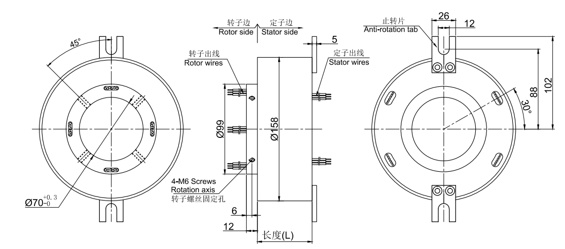 ● 外徑158mm, 通孔直徑為70mm(適用于<=70mm)的標準系列整體式精密導電滑環(huán)。*注意:如需<70mm的內孔,可通過加內襯軸套解決。
