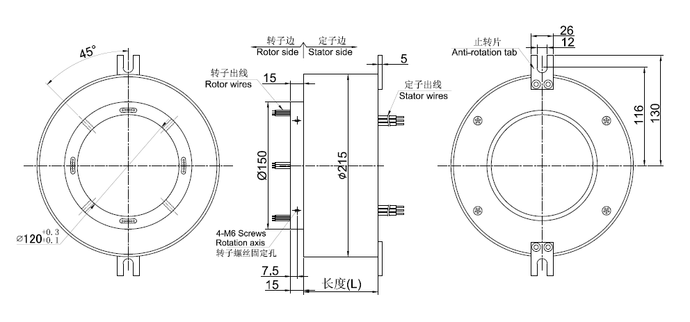● 外徑215mm, 通孔直徑為120mm,適用于<=120mm)的標(biāo)準(zhǔn)系列整體式精密導(dǎo)電滑環(huán)。*注意:如需<120mm的內(nèi)孔,可通過加內(nèi)襯軸套解決。
