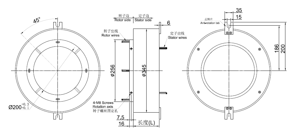● 外徑345mm, 通孔直徑為200mm,適用于<=200mm)的標(biāo)準(zhǔn)系列整體式精密導(dǎo)電滑環(huán)。*注意:如需<200mm的內(nèi)孔,可通過加內(nèi)襯軸套解決。