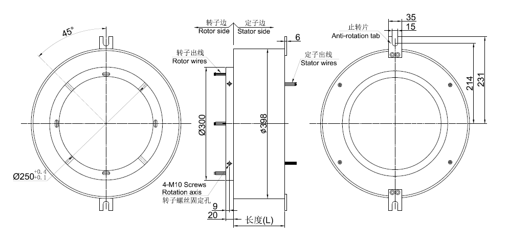 ● 外徑398mm, 通孔直徑為250mm,適用于<=250mm)的標(biāo)準(zhǔn)系列整體式精密導(dǎo)電滑環(huán)。*注意:如需<250mm的內(nèi)孔,可通過(guò)加內(nèi)襯軸套解決。