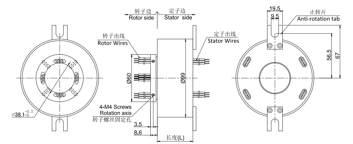 ● 外徑99mm, 通孔直徑為38.1mm,適用于<=38.1mm)的標(biāo)準(zhǔn)系列整體式精密導(dǎo)電滑環(huán)。*注意:如需<38.1mm的內(nèi)孔,可通過加內(nèi)襯軸套解決。