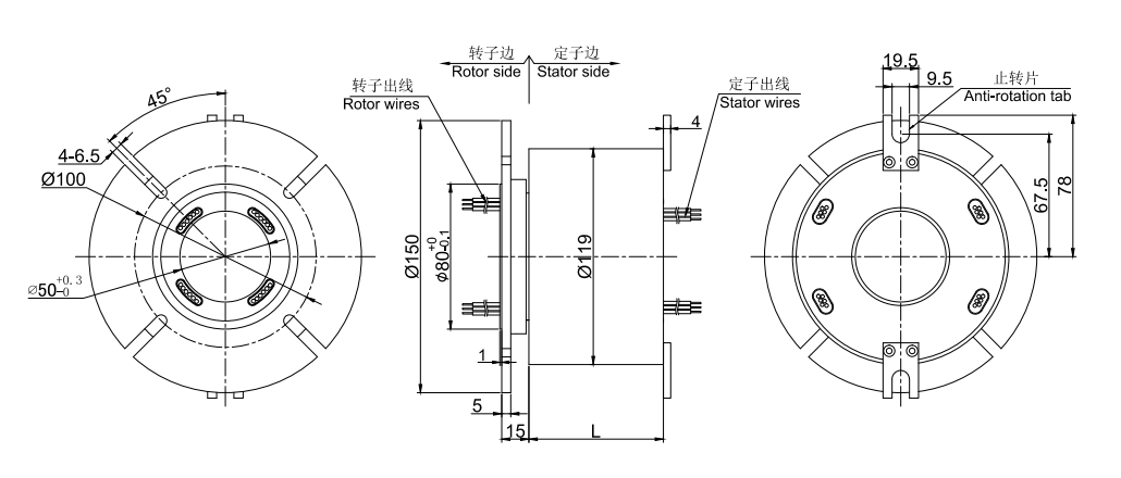 ● 外徑119mm, 通孔直徑為50mm(適用于<=50mm)的標準系列整體式精密導電滑環(huán)。*注意:如需<50mm的內孔,可通過加內襯軸套解決。