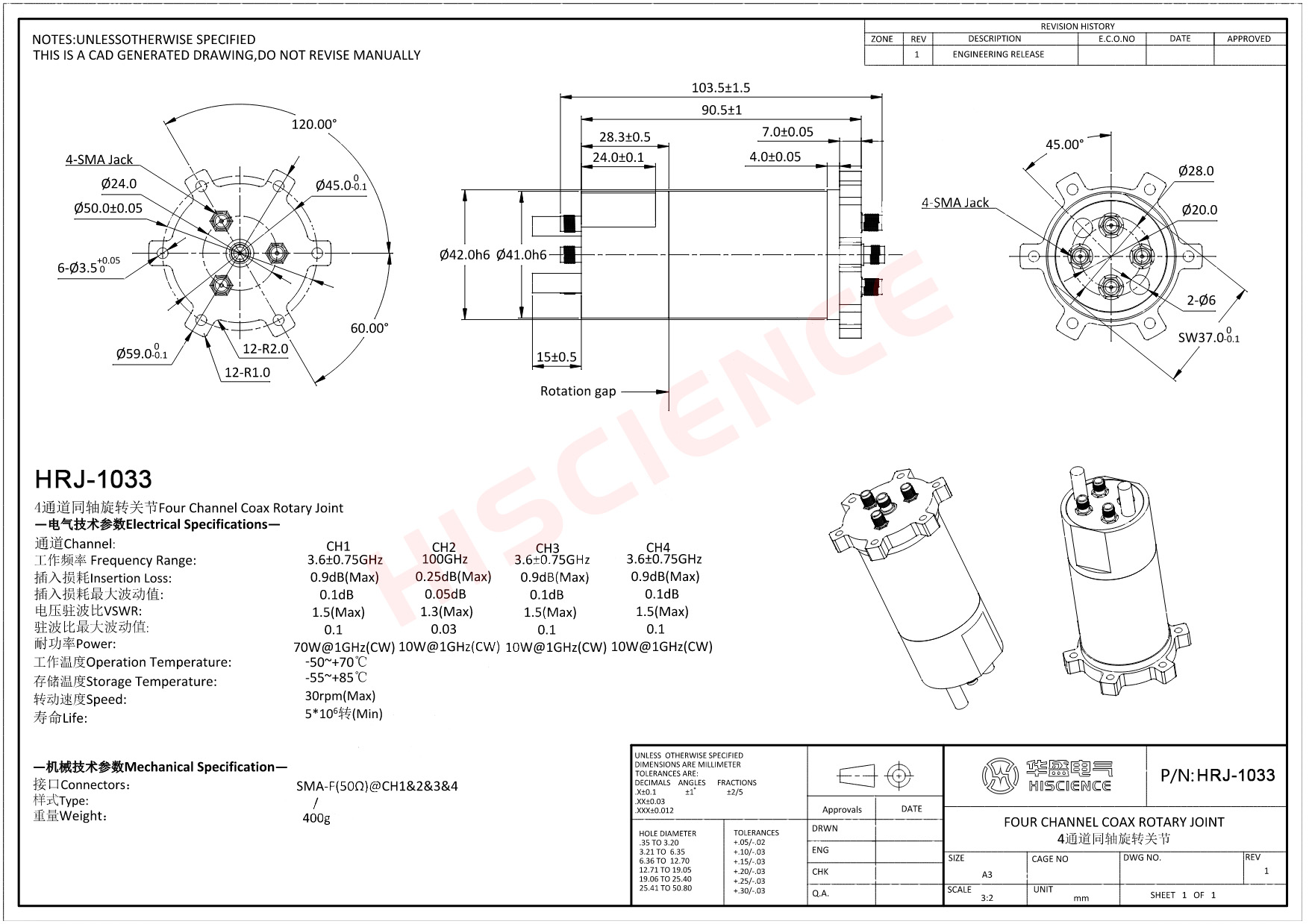 | HR-1033 | 03.6±0.75@CH1 | 4 | 1.3@CH1 | SMA-F | 0.9@CH1 | 70@CH1 |